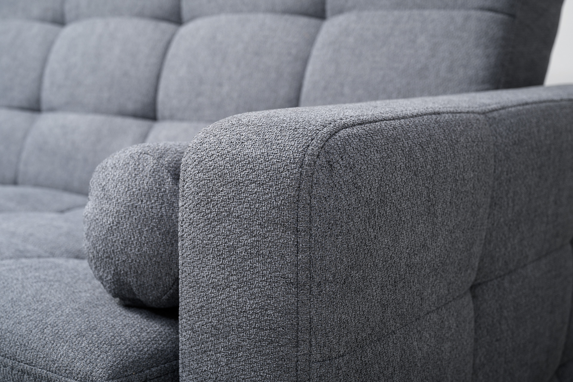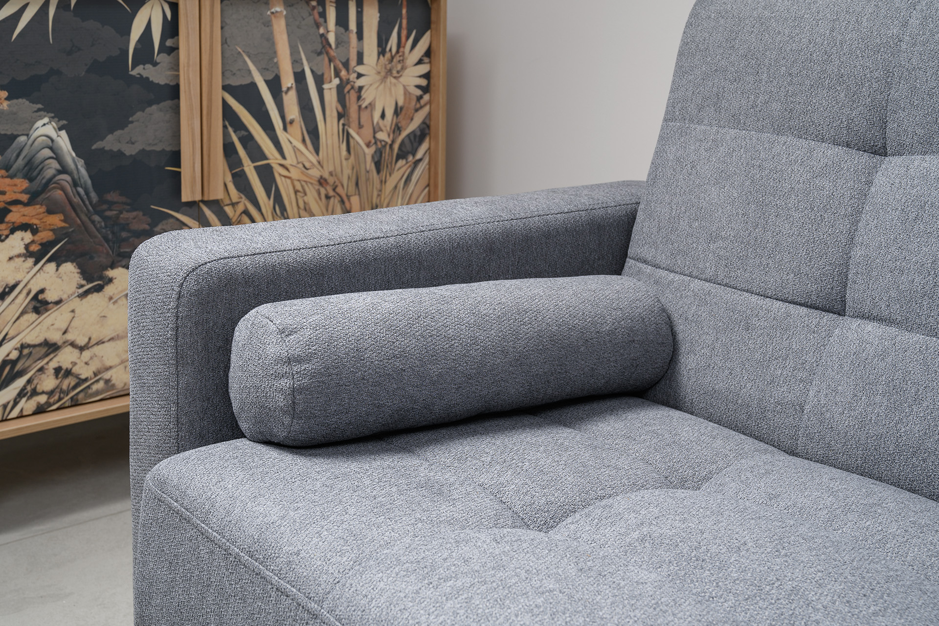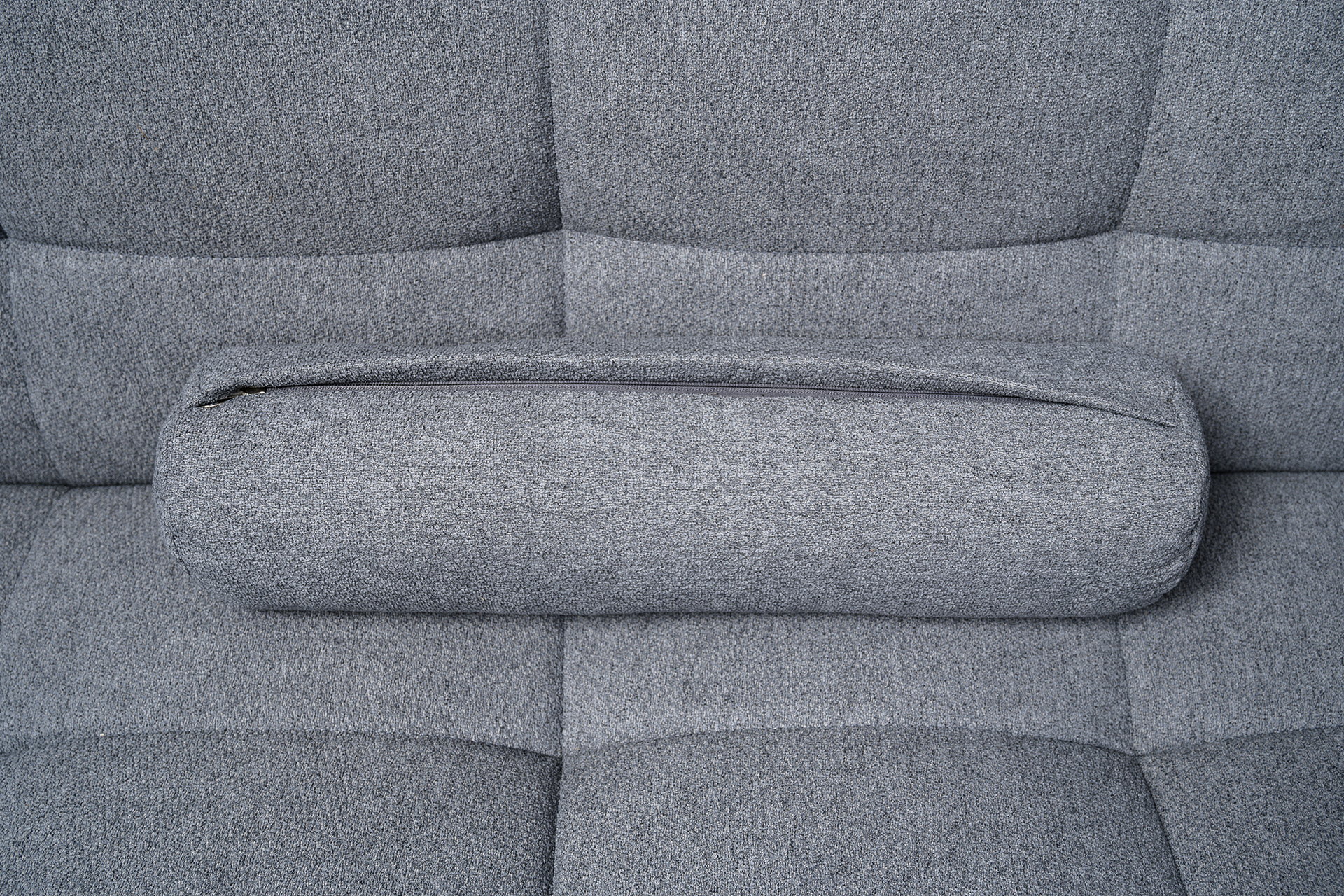 Прямоугольная стежка по спинке, посадочному месту и подлокотниках, круглые подушки-валики