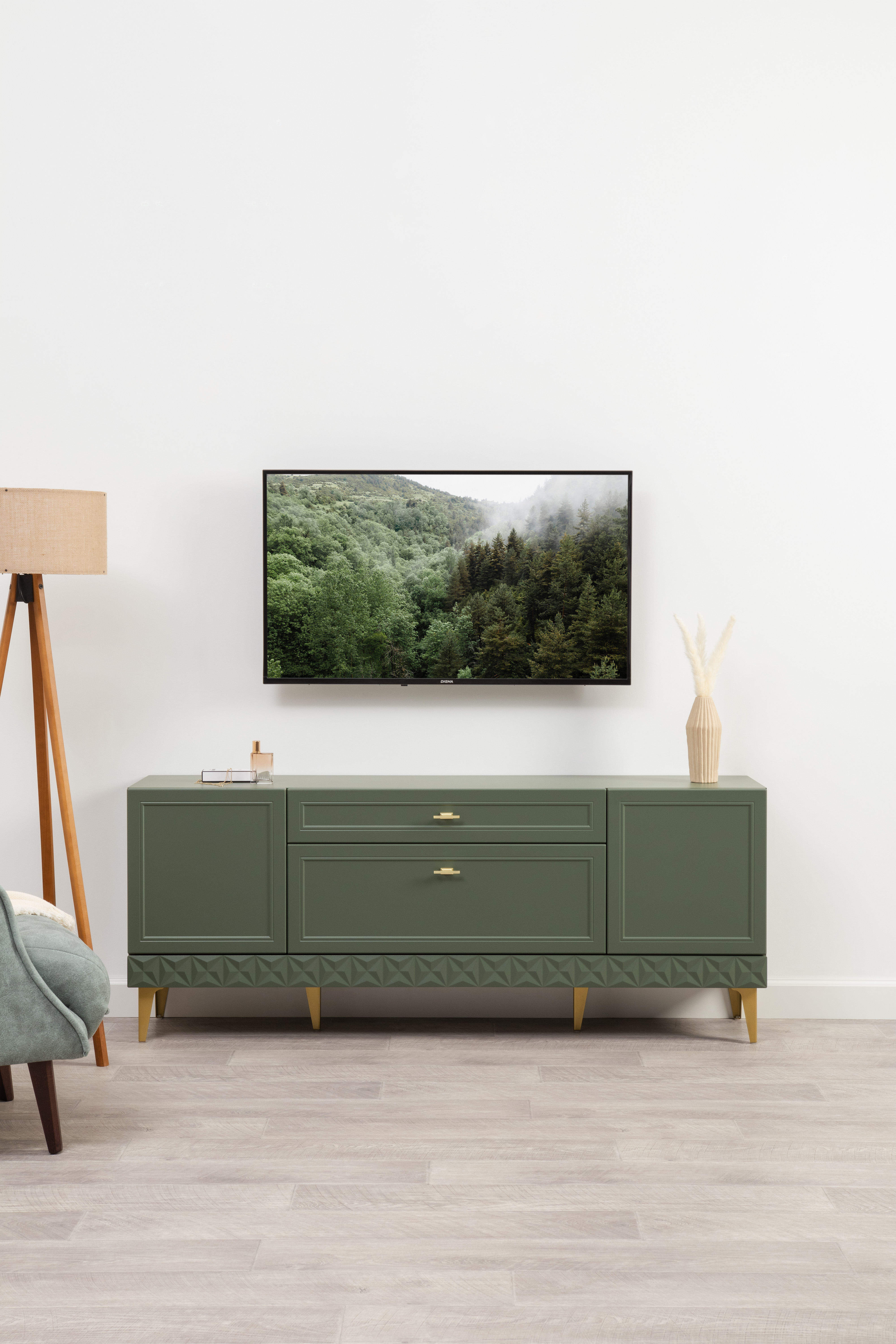 Гостиная Марион композиция 2 дымчатый зеленый K521, олива шагрень AG 1050 ПВХ, белый PE шагрень (собирается на любую сторону)