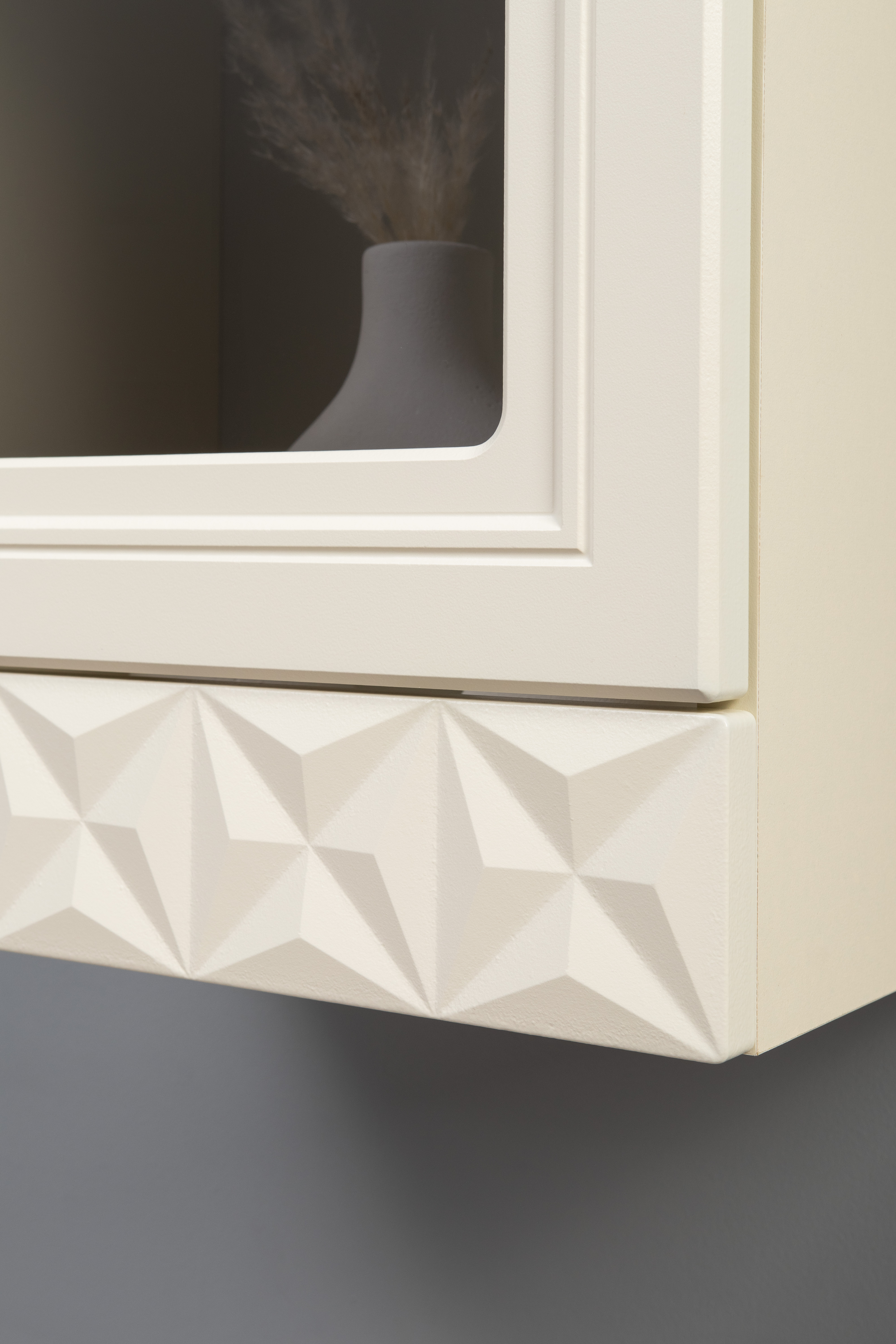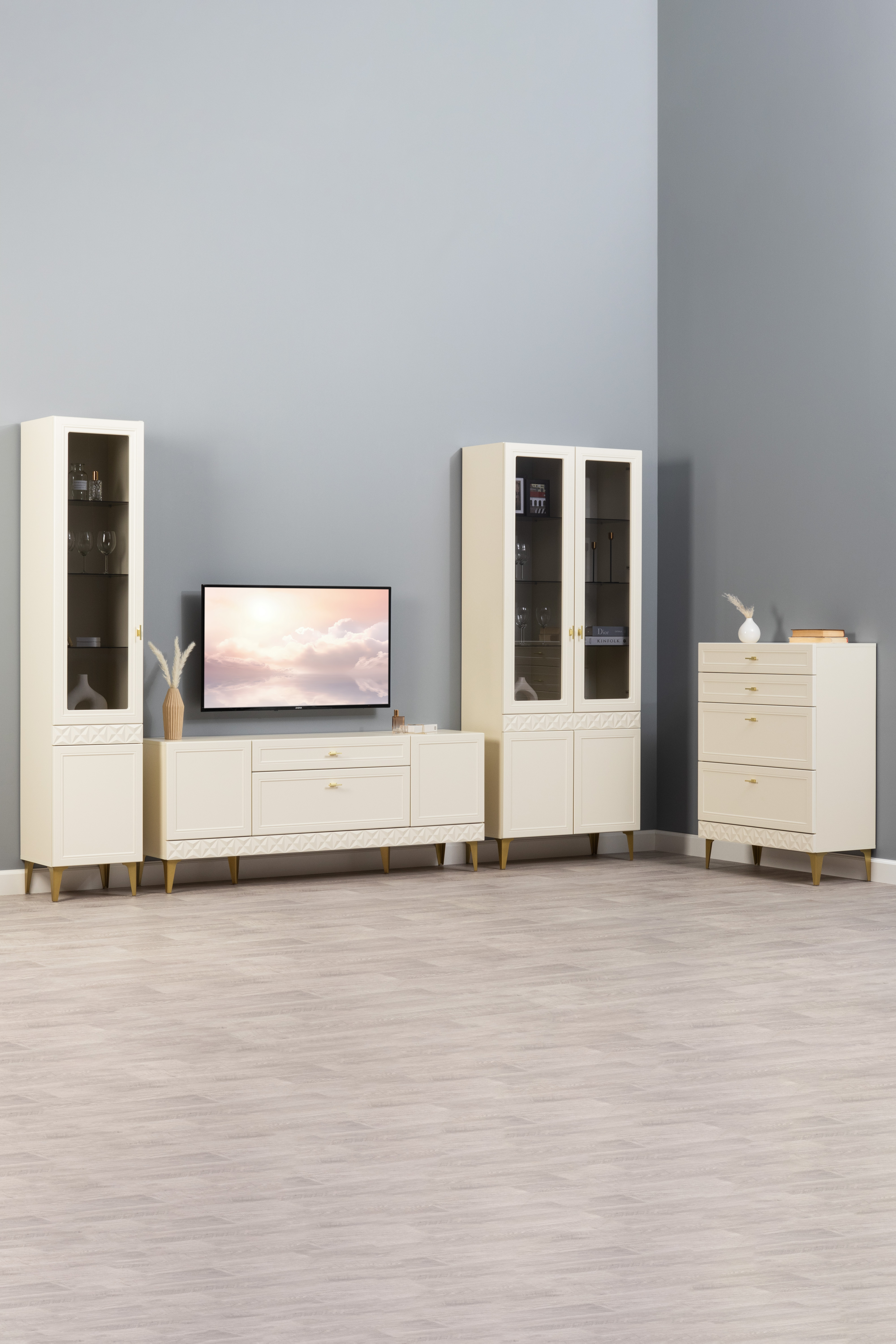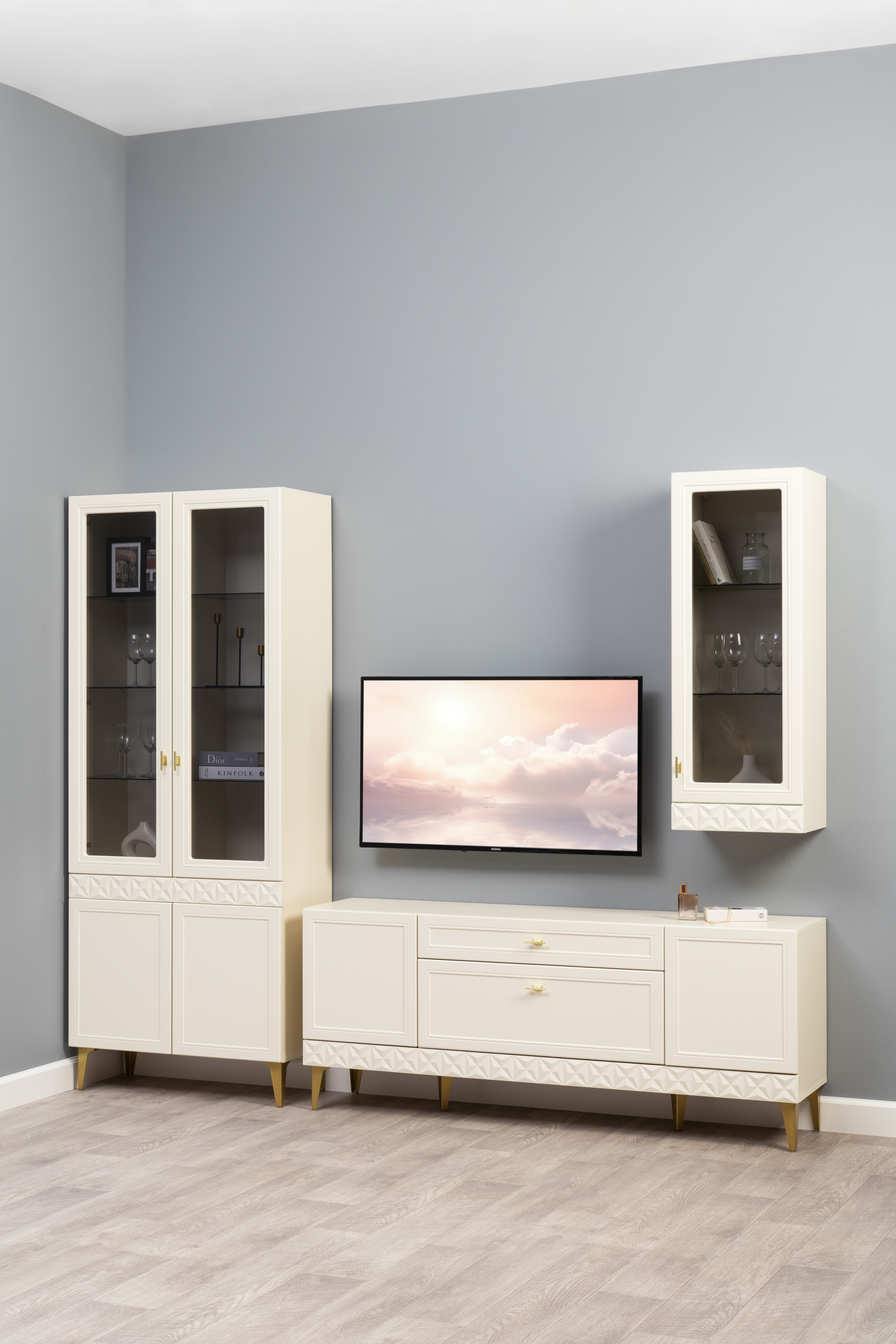 Гостиная Марион композиция 3 слоновая кость С341 PE, слоновая кость 6898 ПВХ, белый PE шагрень (собирается на любую сторону)