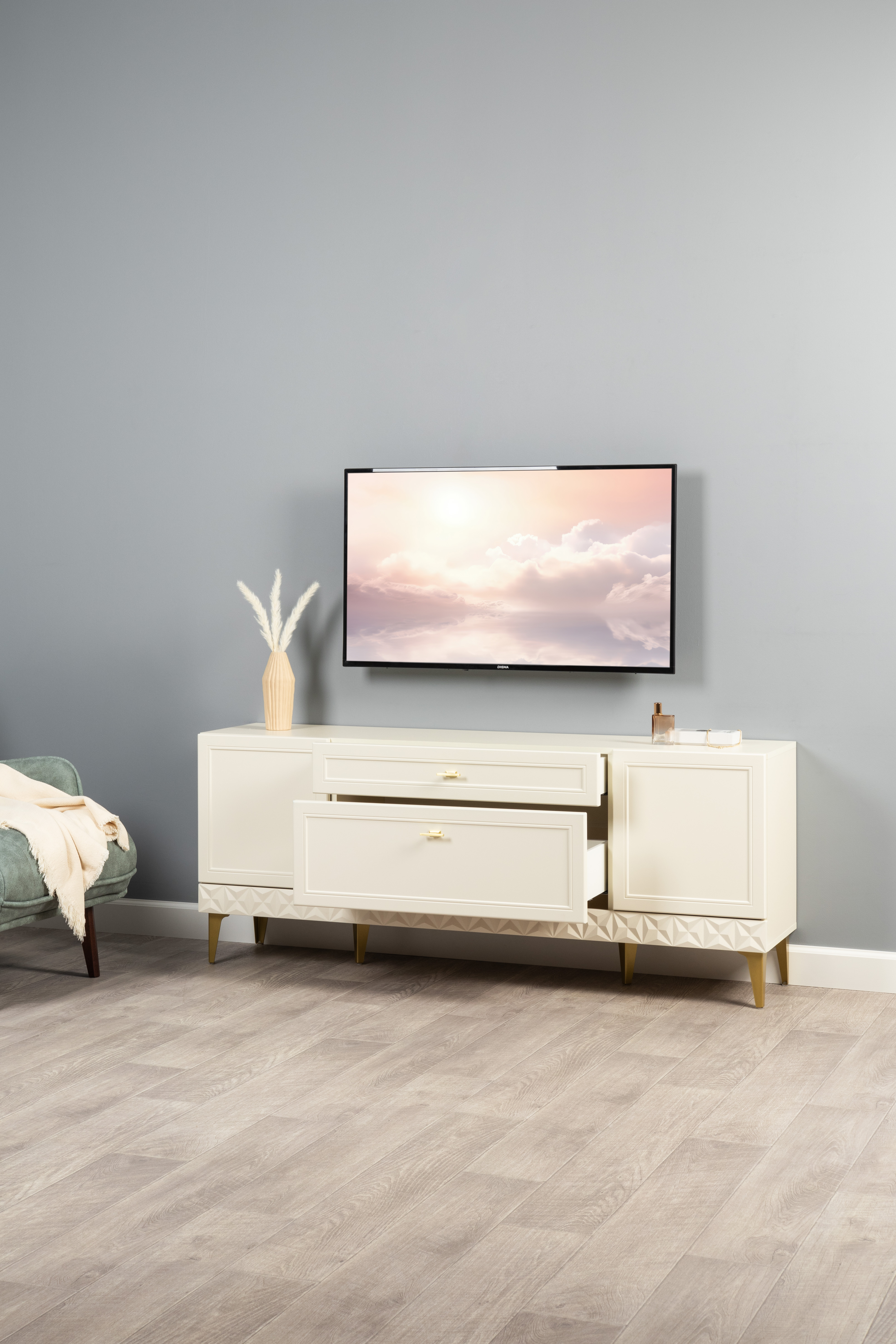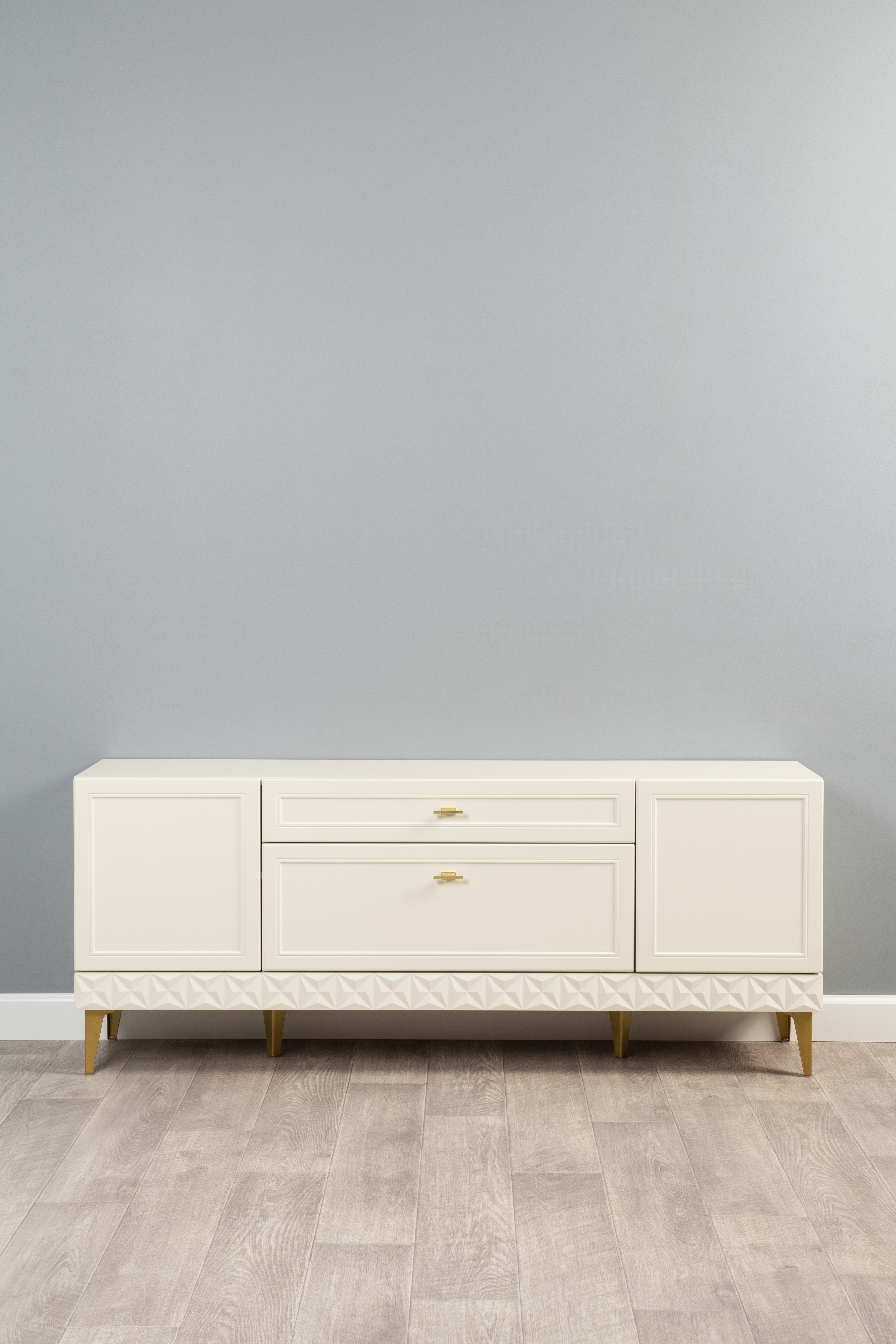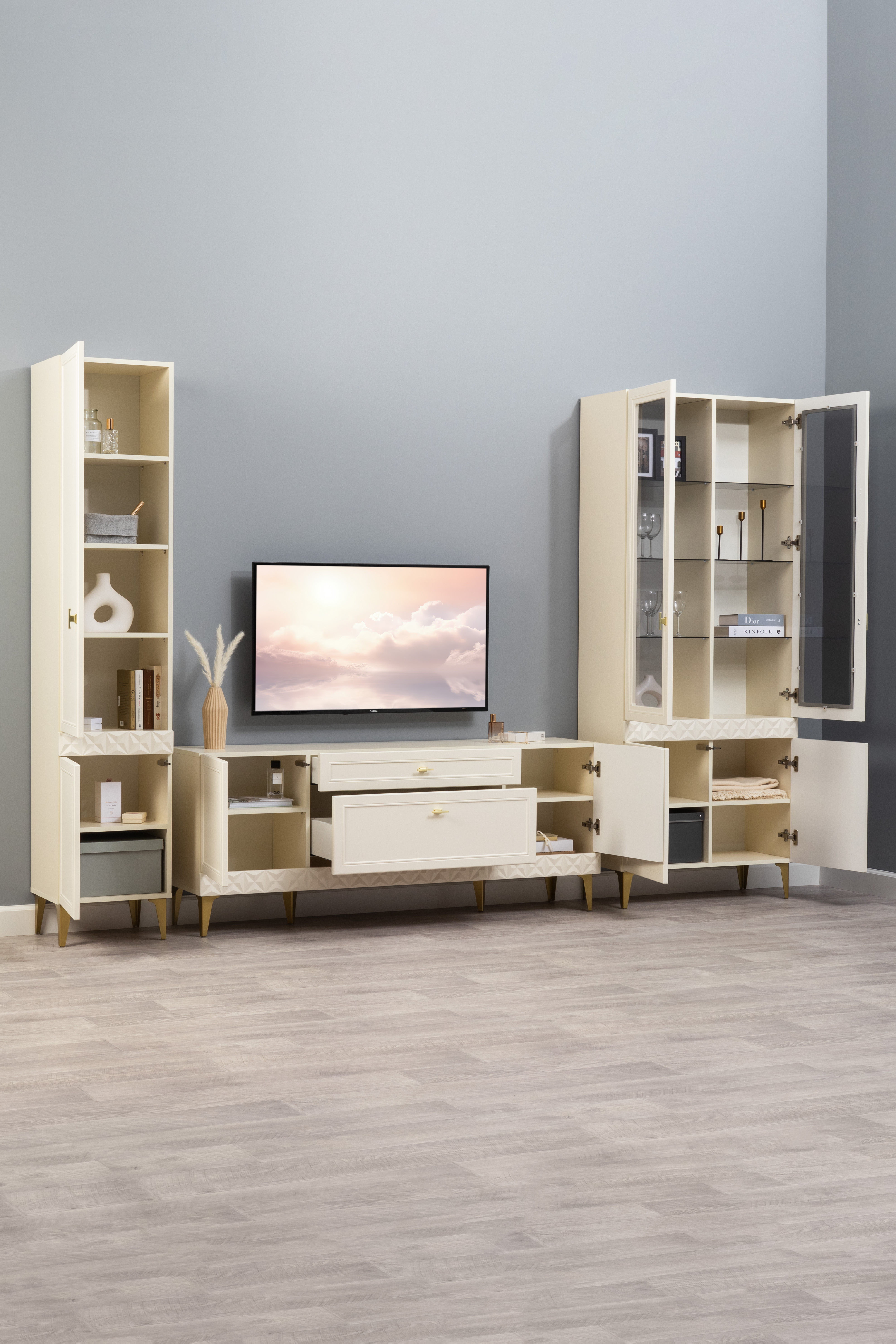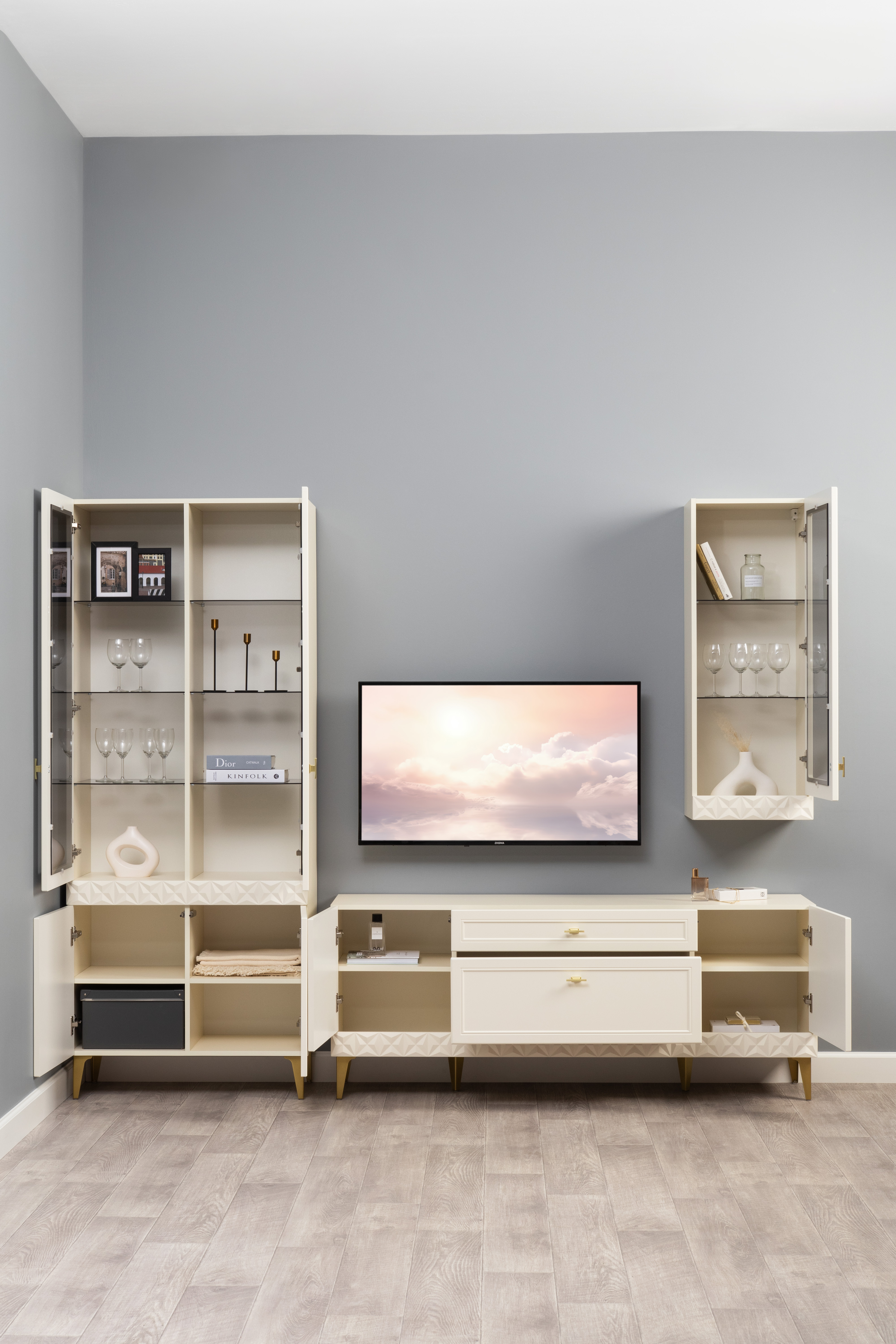 Гостиная Марион композиция 3 слоновая кость С341 PE, слоновая кость 6898 ПВХ, белый PE шагрень (собирается на любую сторону)