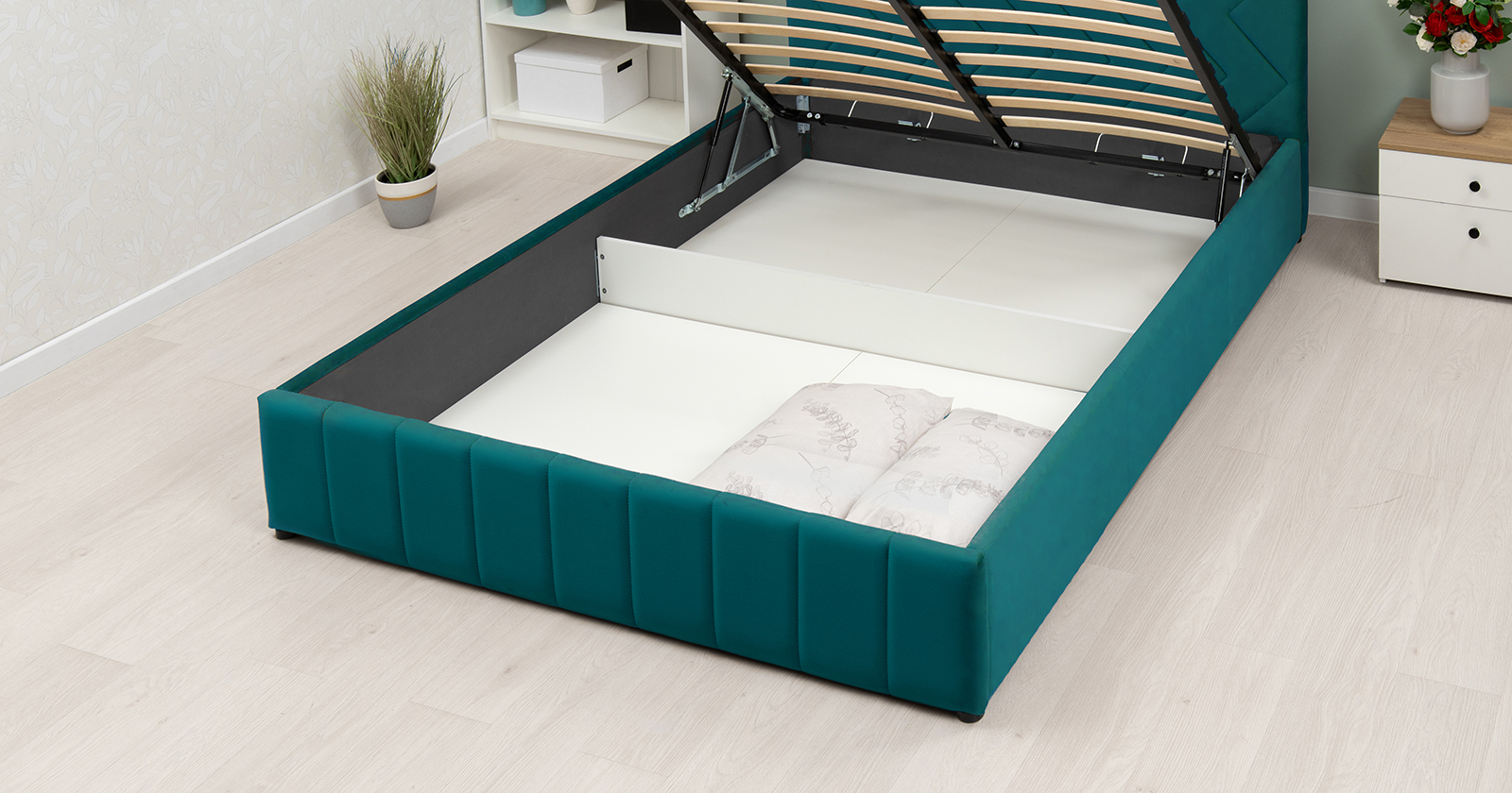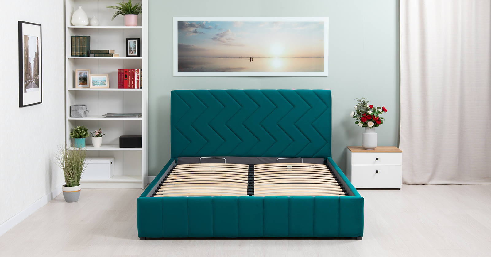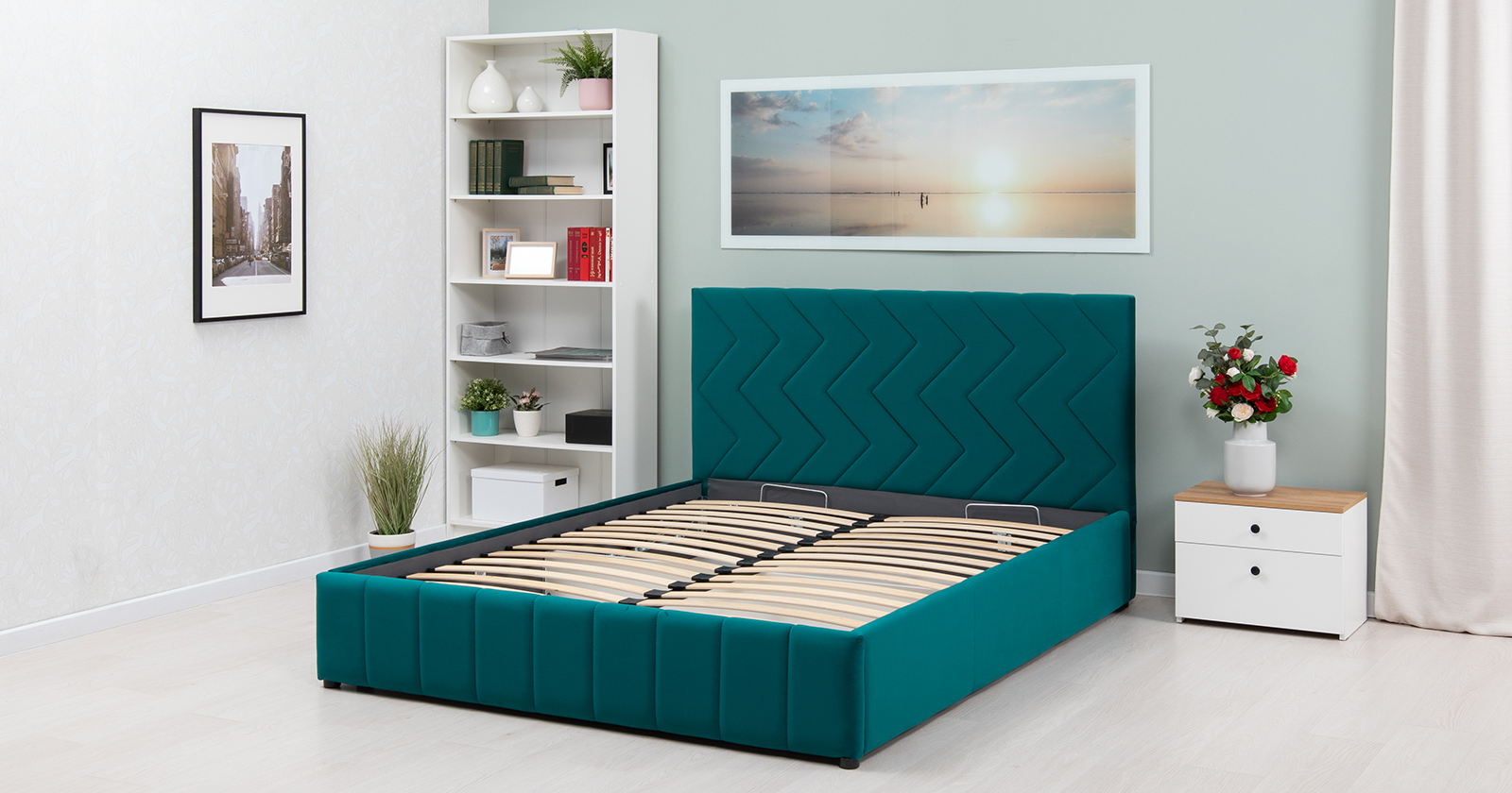 Кровать Милана 160 велюр сине-зеленый с ортопедическим основанием и подъемным механизмом