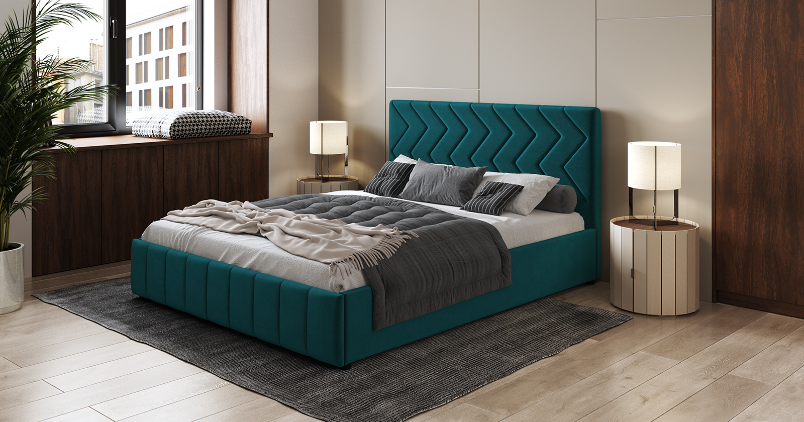 Интерьерная кровать МИЛАНА выполнена в благородном велюре, что подчеркивает объем и геометрию стежки. Выбор сочных цветов обивки делает эту кровать особенно эффектной.